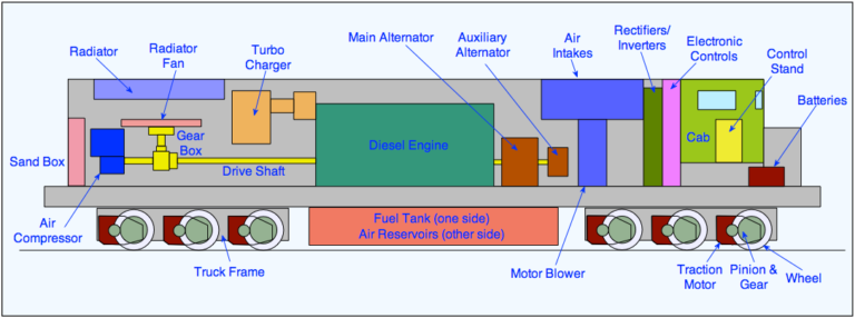 The modern diesel locomotive is a self contained version of the electric locomotive. Like the electric locomotive, it has electric drive, in the form of traction motors driving the axles and controlled with electronic controls. It also has many of the same auxiliary systems for cooling, lighting, heating, braking and hotel power (if required) for the train. It can operate over the same routes (usually) and can be operated by the same drivers. It differs principally in that it carries its own generating station around with it, instead of being connected to a remote generating station through overhead wires or a third rail. The generating station consists of a large diesel engine coupled to an alternator producing the necessary electricity. A fuel tank is also essential. It is interesting to note that the modern diesel locomotive produces about 35% of the power of a electric locomotive of similar weight.